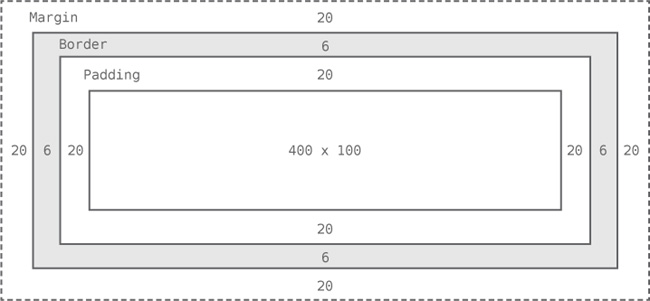 If we add a border or margin, those values will be added to the width or height properties to calculate the full box size. For example, if we add a border of 10 pixels and a padding of 20 pixels around every side of the element with a width of 400 pixels, the actual full width will become 420 pixels.